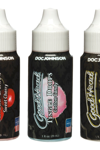 Tingling, tantalizing sensations and three delicious flavors enhance your oral play in this three-piece set of GoodHead Tingle Drops. The tastes of smooth French Vanilla, sugary Cotton Candy, and juicy Sweet Cherry are packed into 1 fl. oz. dropper bottles of these oral sex enhancers formulated to create a cool tingling sensation on contact.