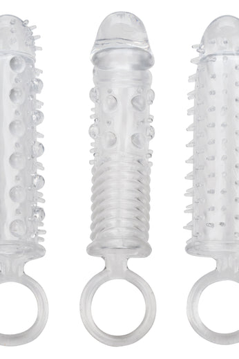 The 3 Piece Extension Kit is a set of 3 tight, close-end extension sleeves with a ribbed texture inside and out for intense stimulation. These enlarging enhancer sleeves wrap tight to increase girth, length and explosive pleasure for everyone involved. The erotic enhancer is tipped with an accentuated solid penis head and reservoir tip that delivers an extra 1" (2.5 cm) of pleasure. While you thrill your lover with increased girth and stimulating ticklers, the fulfilling enhancer's powerful erection support and textured chamber result in explosive results for both of you. The textured chamber and support ring provide increased stimulation and powerful support. Wrap your pleasure tool in this super stretchy sleeve to easily increase stamina, stimulation and orgasmic pleasure. The flexible enhancer is made from a hygienically superior TPE. This body safe material in unscented and phthalate free to keep your most sensitive spots happy and healthy.