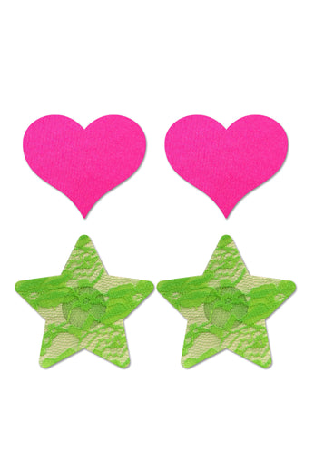 Fashion Pasties Set: Neon Pink Satin Heart, Neon Green Lace Star