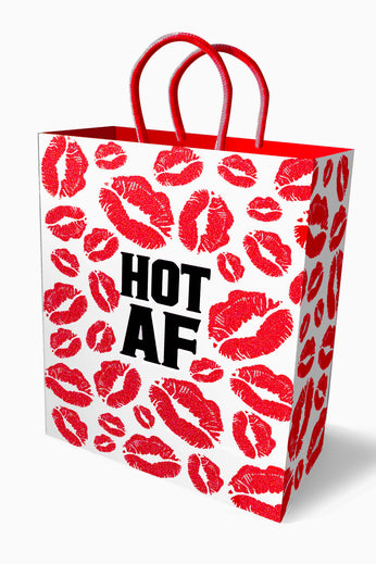Unlike other gift bags, you'll be proud to wrap your naughty gifts in these playfully suggestive bags. High quality, unique gift bags made of thick, sturdy cardstock paper with elegant woven handles. This 10-inch gift bag with all over kisses and the phrase Hot AF printed on both front and back is delightful, as fun to give as it is to receive!