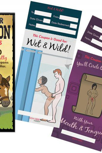 10 Slutty Coupons for her to enjoy. She gets to present coupons to him when she wants to redeem one of the humorous, yet sexually satisfying, coupons. Examples include, A Cunning Linguist and Its a Heavy Snow Day Time For Some Deep Plowing Includes: 10 Hilarious and Sexy Coupons