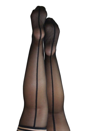 Kix'ies sheer black back-seamed thigh-highs are a day to night wardrobe essential, and a customer favorite! One of the most classically sexy women's legwear styles simply updated with a silicone band! Kix'ies thigh-highs are designed for all-day wear, with a no-slip-grip.