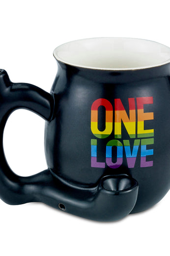 Show your Pride and share the Love with this fabulous LGBT inspired mug. It makes a great gift for a birthday, wedding, retirement, or anniversary celebration. This cool novelty mug is made of ceramic and holds around 11oz. It comes in a matt black color with a white inside. The mug is decorated with the words 'One Love' in LGBT inspired rainbow colors.