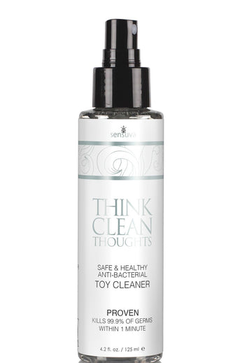 Think Clean Thoughts is a quick and simple-to-use anti-bacterial cleaning spray, containing active anti-microbial ingredients proven to kill 99.9% of all bacteria, and it is mild enough to not cause irritation to delicate tissue. Made with healthy ingredients such as: water, witch hazel extract, grape seed extract, sweet orange and other true essential oils. Think Clean Thoughts is a better choice for cleaning pleasure products than standard bar hand and body soaps because it is oil-free and will not break down toy materials, nor does it leave any residue that may be irritating to delicate tissue. Simple to use: spray directly onto pleasure products both prior to use, and afterward. Wipe away extra fluid.