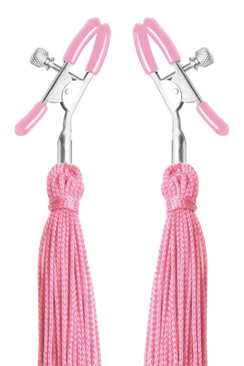 Adorn yourself with these sexy pink nipple tassels from Frisky! Soft cotton candy colored tassels will dangle enticingly from your nipples, and are the perfect addition to any lingerie set. Give your nipples a pleasured pinch with the adjustable bullnose style nipple clamps that are quickly and easily made tighter or more loose with the screws on the side. Rubber tipped ends ensure a good grip with plenty of comfort.