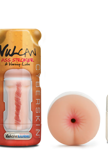 The Vulcan Ass Stroker and Warming Lube offers an authentic simulation of anal sex from its tight elastic opening to its finely ribbed snug sleeve. The gently warming water-based lubricant heightens sensations while the grip and pull of the textured tunnel coaxes users to a satisfying release. The extraordinary sensations of this masturbator also make it an effective stamina training tool, helping develop technique and staying power through use and practice. Cyberskin is a soft, durable material that lasts a long time and is easy to clean and care for. Simply turn the 100% waterproof sleeve inside out, wash with antibacterial soap and warm water, and dry completely after each use. Keep this stroker looking and feeling brand new with